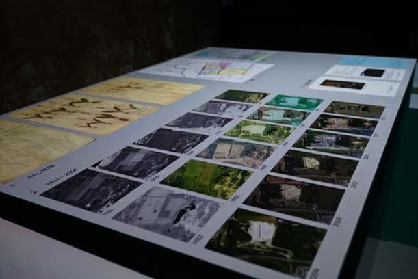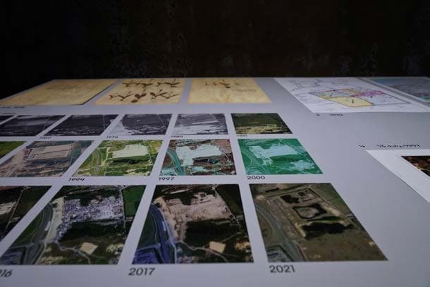 The next piece consists of several green square pedestals, each topped with a neat row of over sixty aerial photographs. It is a camp, how over the the expanse of green has become a deep, dead gray. You can see in the successive photos from year to year how the concrete boundary lines have compressed, squeezed, and the lush green, how the brutal straight lines have pierced the soft, green expanse, how the footsteps of urban expansion have repeatedly stomped on this place. Next to photos are the plant specimens that the botanist here has drawn, the plants that were once here.