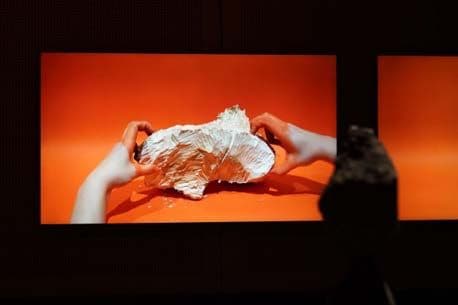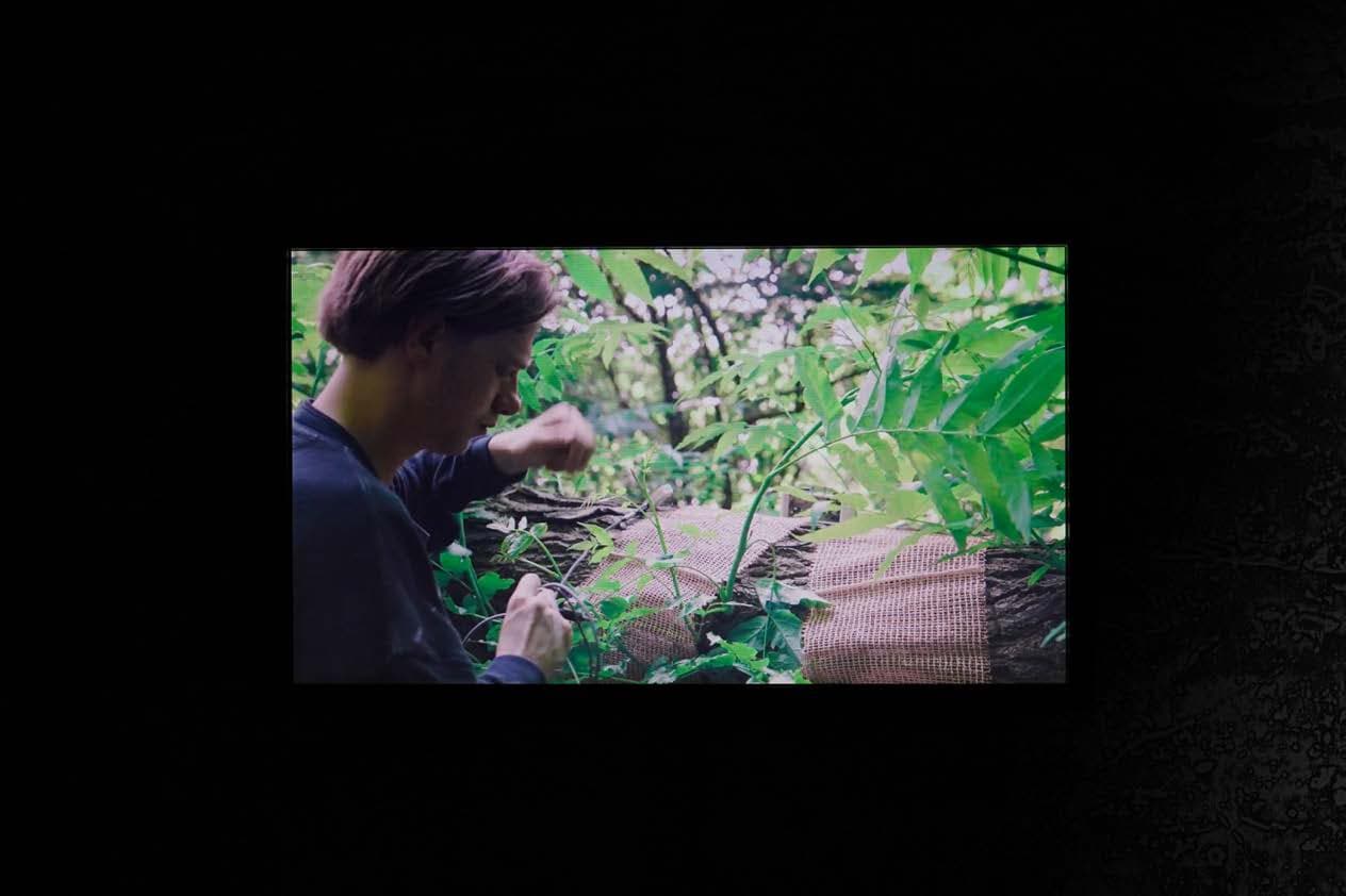 In reality, this is a study of beavers, the bright orange representing their incisors, and the piece of wood in the exhibition hall is a work "carved by the beavers. The author is based on the process of introducing beavers to develop the fur industry in the United States in 1946 but failed, and triggered problem of beaver species invading and threatening local waters. The author uses hand movements to imitate the activities of beaver incisors, and uses an abstract form of body language try a new narrative experiment.