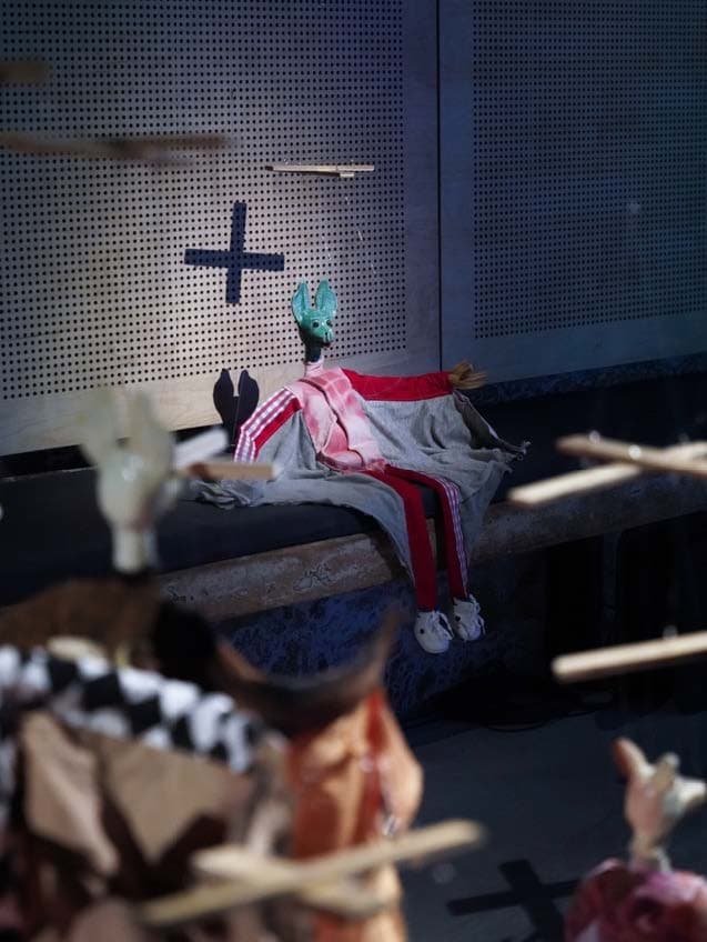 A cluster of anthropomorphic bats, made of hand-crafted ceramics and dressed in fabric attire, suddenly appeared behind a few concrete pillars. bat protagonist, named Lucius, sat cross-legged on the gravel, gazing into the distance or staring intently at the two large screens in front of them.