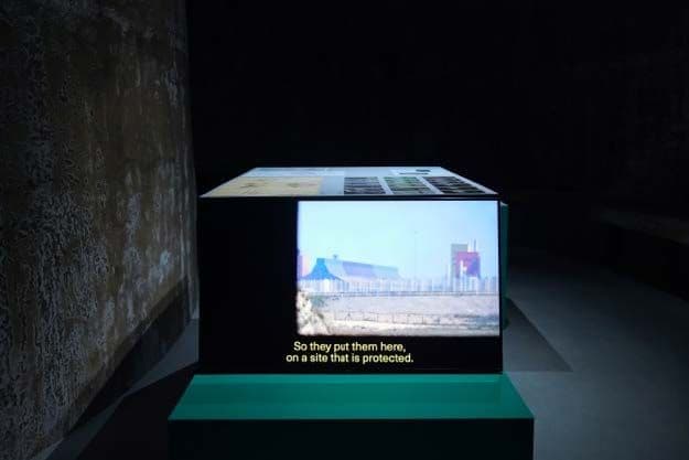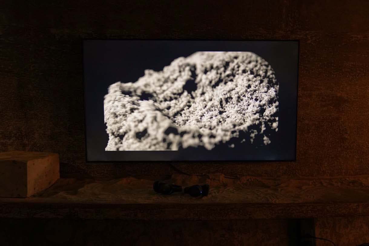 Walking further ahead, a large screen surrounded by sand and gravel is nestled against the wall. In front of the screen, two pairs of earphones are casually placed in the sand. I pick up one earphone and shake off the dust. An indescribable sound of sand rubbing against each other gently emanates from the earpiece. This is an experimental video expressing the development of sandcastle coral reefs. In the video, beaches that have been dug into cliffs are interspersed. A large amount of yellow sand is loaded onto trucks and transported to construction sites. The miners have almost reached the limit of what they can dig at the edge. The ecosystem of the Normandy coastline is being affected by human activities. On the concrete slab next to this screen, there is a coral shell that has vanished. When I put down the earphones, I catch a glimpse of a line of small characters on the screen: "Seventy percent of the beach sand in the world is used by people for production and manufacturing."
