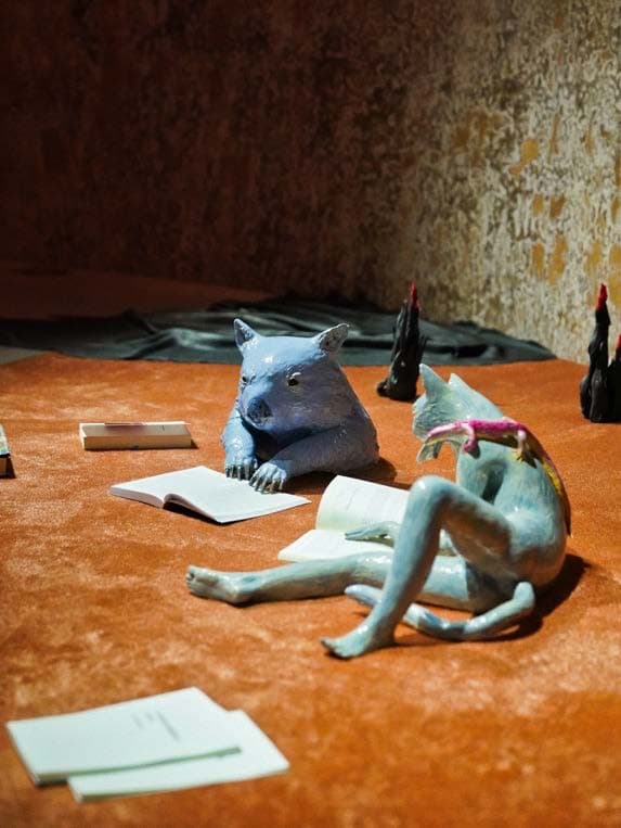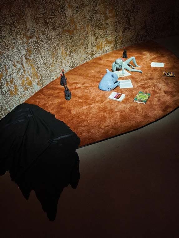 This is the koala reading corner. The work originated from the Australian bushfire in 2020, which was called "Black Summer" burned for a whole year, taking the lives of 434 humans and hundreds of millions of animals. In the investigation after the event, it was found that they were the with the highest survival rate. During the fire, they dug small holes to hide in and welcomed other small animals who came to seek refuge. On the carpet in the work, two animals are leisurely lying on the carpet reading, surrounded by books carefully selected by the author for them, and on the outermost part of the work, there are black fire sculptures