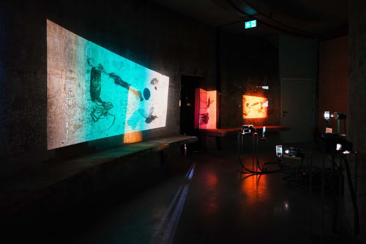 The clack of old-fashioned slide projectors rise and fall in unison, marking the last item in this exhibition. Four machines are placed at odd to each other, their projected images often overlapping and superimposing, with the coloured light changing every two seconds to wash the room in a new hue, no matter from which angle view it you can, at one point or another, see the picture on the wall next to you. The slides contain outlines, skeletons and even splinters of insects, magn and displayed on the coloured glass of the slide projectors. Beautiful in colour, but how discomfiting to look at closely. Insecticides, windscreens, climate change