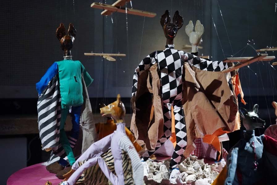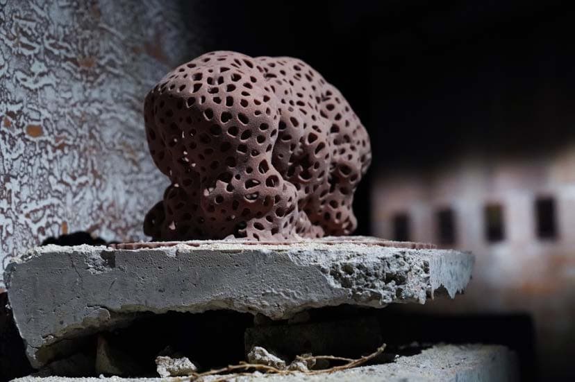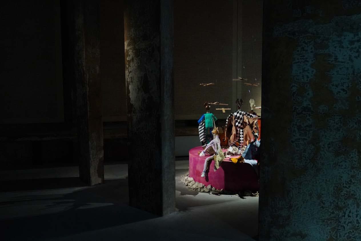A cluster of anthropomorphic bats, made of hand-crafted ceramics and dressed in fabric attire, suddenly appeared behind a few concrete pillars. bat protagonist, named Lucius, sat cross-legged on the gravel, gazing into the distance or staring intently at the two large screens in front of them.