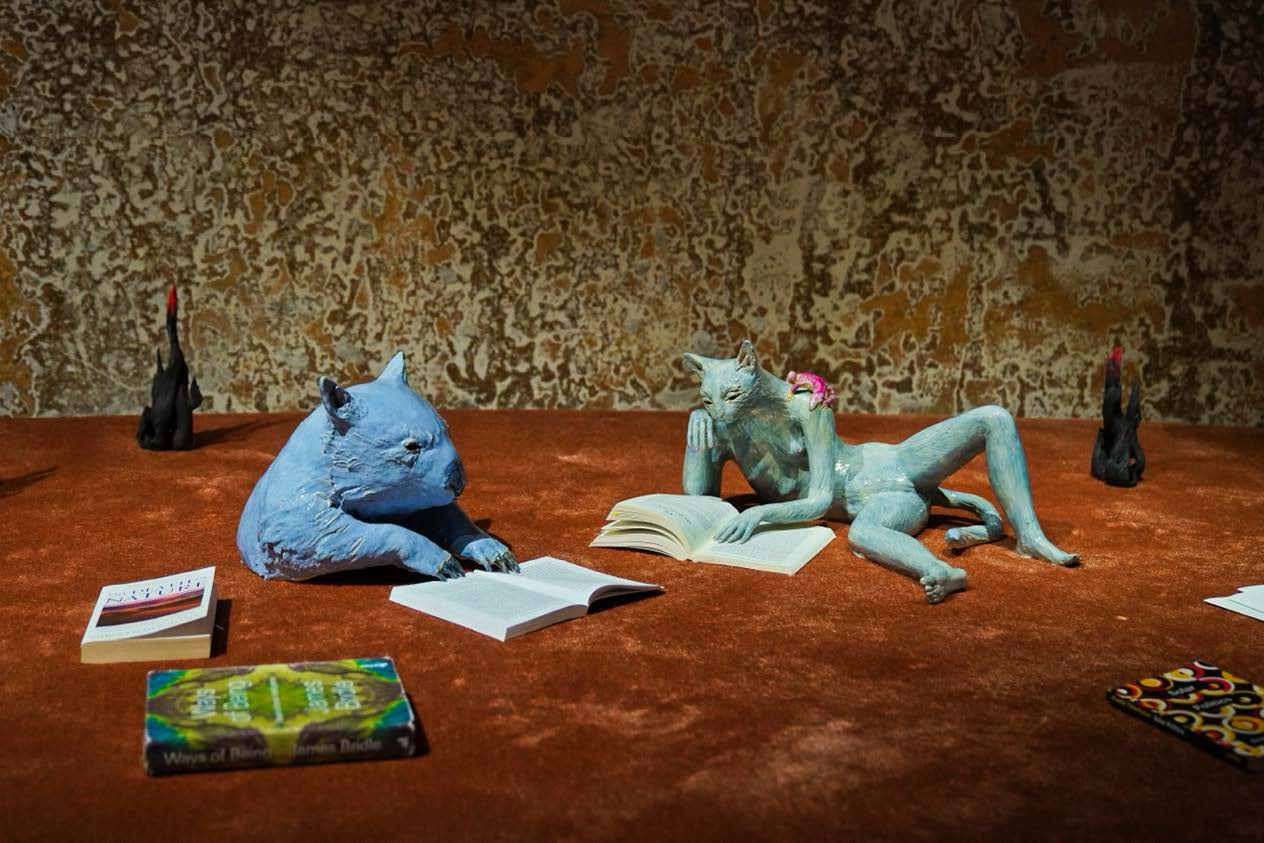 This is the koala reading corner. The work originated from the Australian bushfire in 2020, which was called "Black Summer" burned for a whole year, taking the lives of 434 humans and hundreds of millions of animals. In the investigation after the event, it was found that they were the with the highest survival rate. During the fire, they dug small holes to hide in and welcomed other small animals who came to seek refuge. On the carpet in the work, two animals are leisurely lying on the carpet reading, surrounded by books carefully selected by the author for them, and on the outermost part of the work, there are black fire sculptures