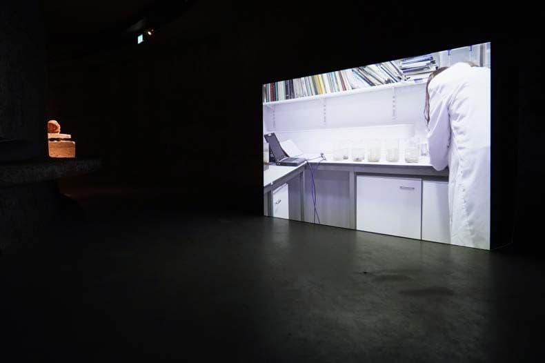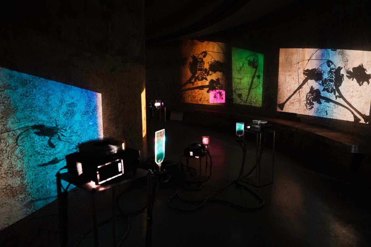 The clack of old-fashioned slide projectors rise and fall in unison, marking the last item in this exhibition. Four machines are placed at odd to each other, their projected images often overlapping and superimposing, with the coloured light changing every two seconds to wash the room in a new hue, no matter from which angle view it you can, at one point or another, see the picture on the wall next to you. The slides contain outlines, skeletons and even splinters of insects, magn and displayed on the coloured glass of the slide projectors. Beautiful in colour, but how discomfiting to look at closely. Insecticides, windscreens, climate change