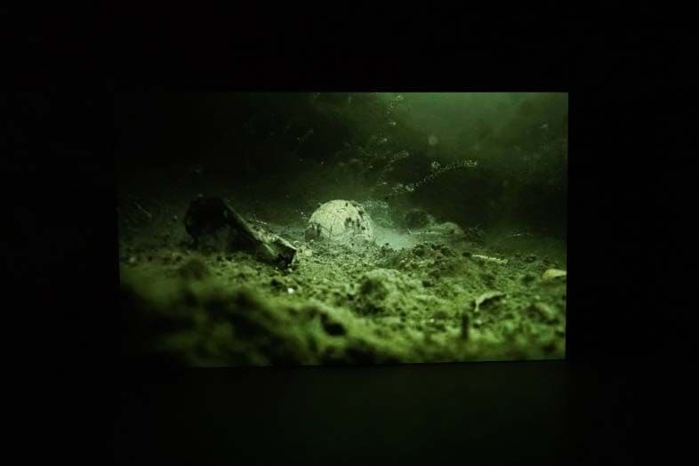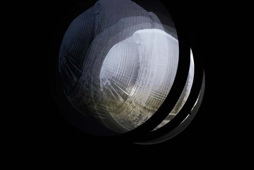 A strange rotating sphere caught my eye in the distance, its image projected onto the surface of the shell rotating slowly, a suspended device arranged in a series of three of arched shells. Passing it, one enters the second space of this subterranean structure.