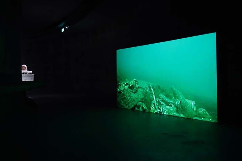 Walking further ahead, a large screen surrounded by sand and gravel is nestled against the wall. In front of the screen, two pairs of earphones are casually placed in the sand. I pick up one earphone and shake off the dust. An indescribable sound of sand rubbing against each other gently emanates from the earpiece. This is an experimental video expressing the development of sandcastle coral reefs. In the video, beaches that have been dug into cliffs are interspersed. A large amount of yellow sand is loaded onto trucks and transported to construction sites. The miners have almost reached the limit of what they can dig at the edge. The ecosystem of the Normandy coastline is being affected by human activities. On the concrete slab next to this screen, there is a coral shell that has vanished. When I put down the earphones, I catch a glimpse of a line of small characters on the screen: "Seventy percent of the beach sand in the world is used by people for production and manufacturing."