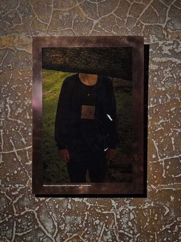 On the copperplate print, a young man carrying radio wave measurement equipment stands in the rainforest and wetland. The probes are carefully arranged on the vegetation. The author is capturing the sounds among non-human species such as plants and trying to build the possibility of communicating with other species through sound. He hopes to have a system that is not "human-centered", so that radio broadcasting is not only a carrier for spreading human-related content, but also becomes a communication medium in the natural world.