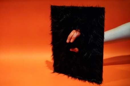 A rough piece of wood stands before an orange backdrop, human hands gripping a white stone in a laborious and awkward posture, trembling, peeling, twisting.